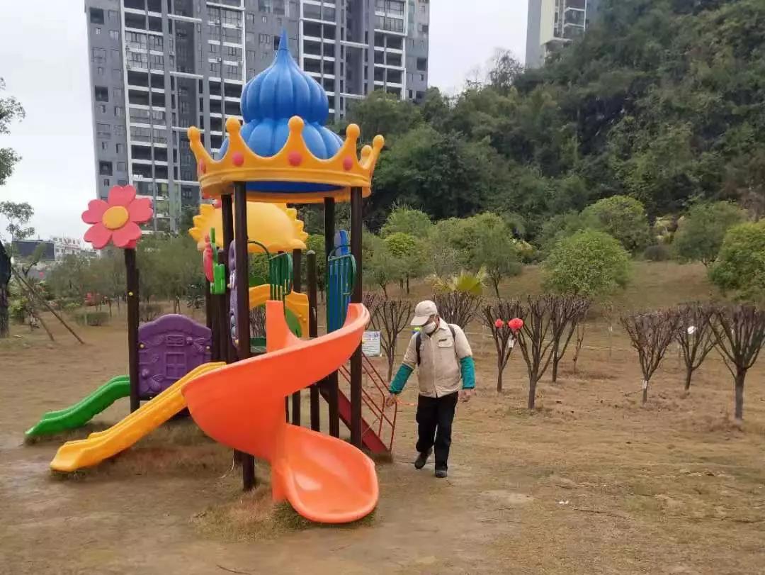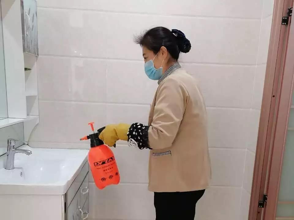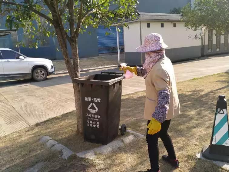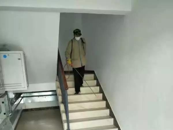 ▲桂醫(yī)·熙境項(xiàng)目對(duì)電梯、單元樓大廳、客服中心等地噴灑消毒水。