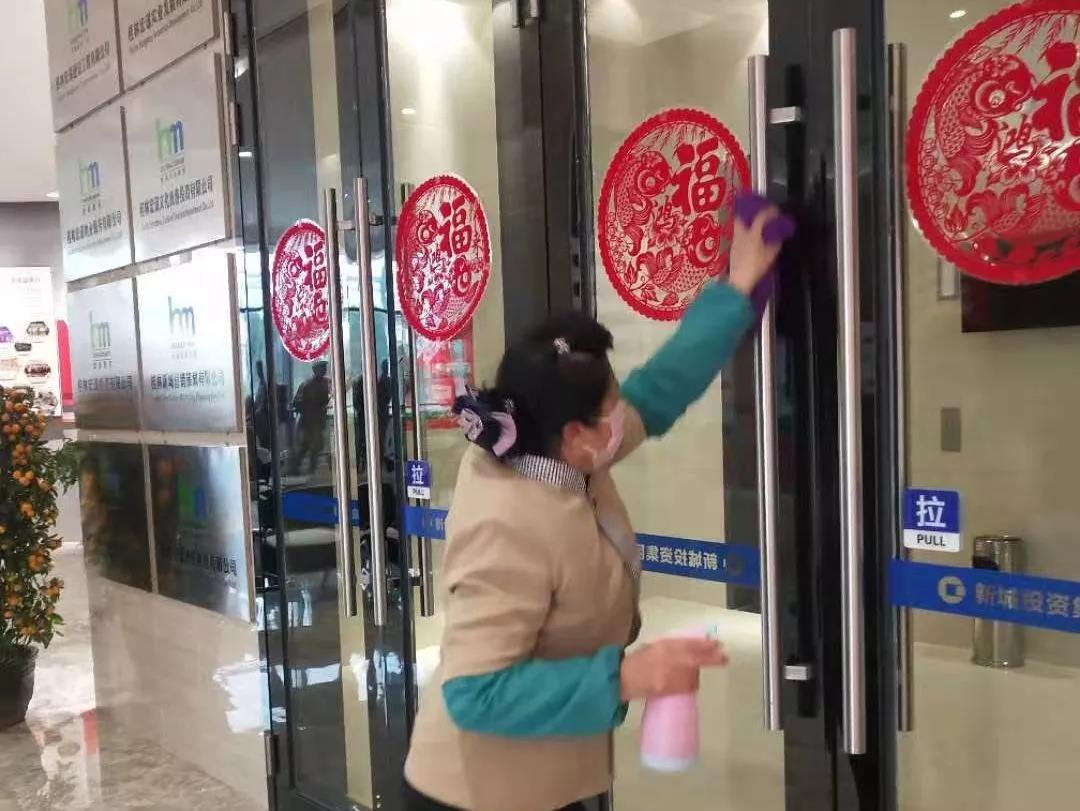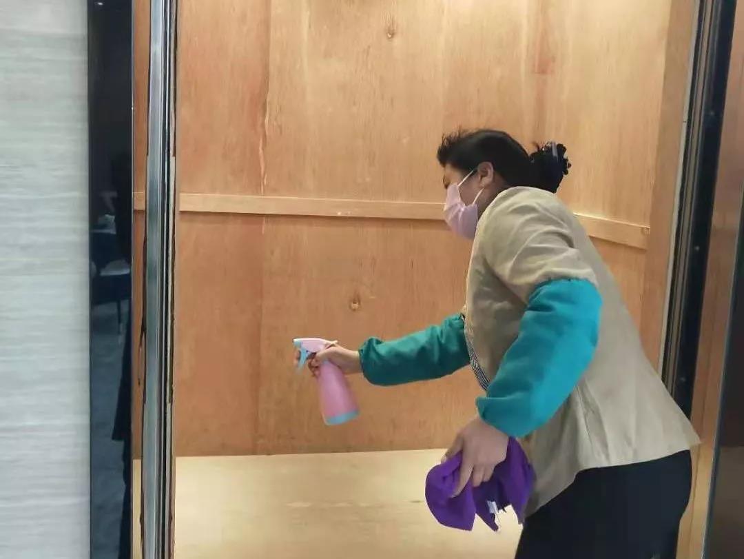 ▲新城投資集團(tuán)辦公樓項(xiàng)目對(duì)出入門廳、電梯、門把手、茶水間等位置進(jìn)行重點(diǎn)消毒。