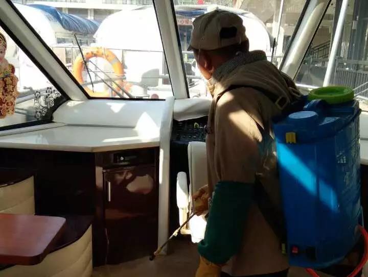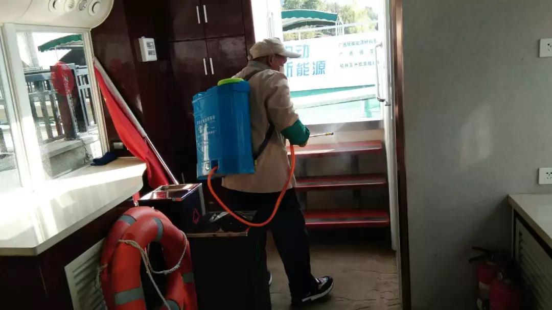 ▲游船項(xiàng)目對(duì)碼頭、游船內(nèi)部進(jìn)行消毒。