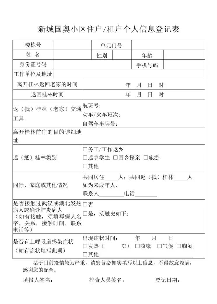 “您好!根據(jù)臨桂區(qū)疫情防控指揮部及新區(qū)管委會(huì)的要求,為切實(shí)做好疫情防控工作,杜絕在本小區(qū)內(nèi)發(fā)現(xiàn)疫情隱患,我們將對小區(qū)內(nèi)所有的住戶進(jìn)行逐一排查,請您配合我們填寫《新城國奧小區(qū)住戶/租戶個(gè)人信息登記表》。”
