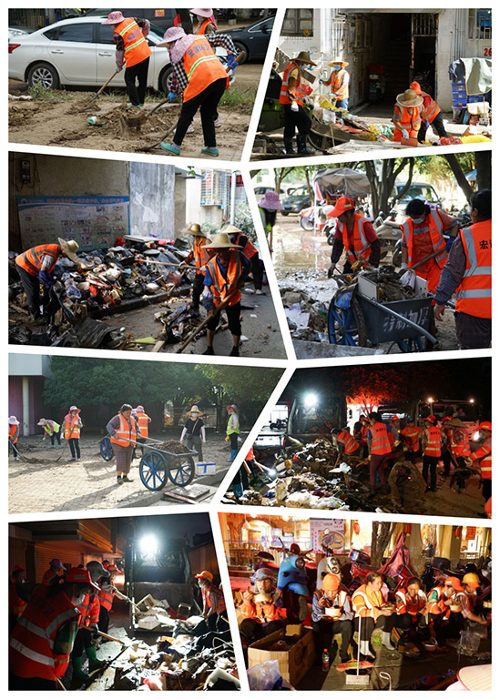 在龍船坪小區(qū)、安新小區(qū)、寧遠(yuǎn)小學(xué)及周邊街道,一群身著橘紅色馬甲、印有“宏謀環(huán)衛(wèi)”的環(huán)衛(wèi)工人成為了救災(zāi)現(xiàn)場的一道亮麗風(fēng)景線。他們不畏艱難,深一腳淺一腳地踩在垃圾堆和泥漿中,一鍬一鍬地清理垃圾和淤泥。現(xiàn)場工作人員齊心協(xié)力,面對(duì)困難毫不退縮,甚至唱起了《團(tuán)結(jié)就是力量》來鼓舞士氣。經(jīng)過晝夜奮戰(zhàn),他們終于將小區(qū)道路上的垃圾清運(yùn)完畢,有效保障了道路的正常通行和居民的出行安全,及時(shí)防止災(zāi)后疫情的發(fā)生。