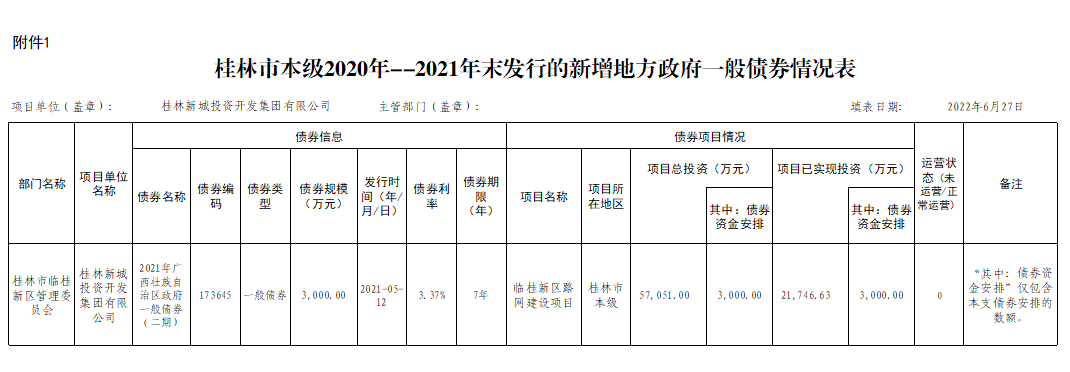 截至2021年末,桂林新城投資開發(fā)集團(tuán)有限公司及所屬單位獲得2021年新增政府一般債券資金3,000.00萬元,安排用于本部門及所屬單位1個(gè)項(xiàng)目,其中:臨桂新區(qū)路網(wǎng)建設(shè)項(xiàng)目3,000.00萬元。從項(xiàng)目實(shí)施進(jìn)度看,臨桂新區(qū)路網(wǎng)建設(shè)項(xiàng)目總投資57,051萬元,其中2021年債券資金安排3,000.00萬元;截至2021年末已實(shí)現(xiàn)投資21,746.63萬元,其中2020年債券資金安排3,000.00萬元。從項(xiàng)目運(yùn)營情況看,截至2021年末,該項(xiàng)目尚在建設(shè)期未開始進(jìn)行運(yùn)營。