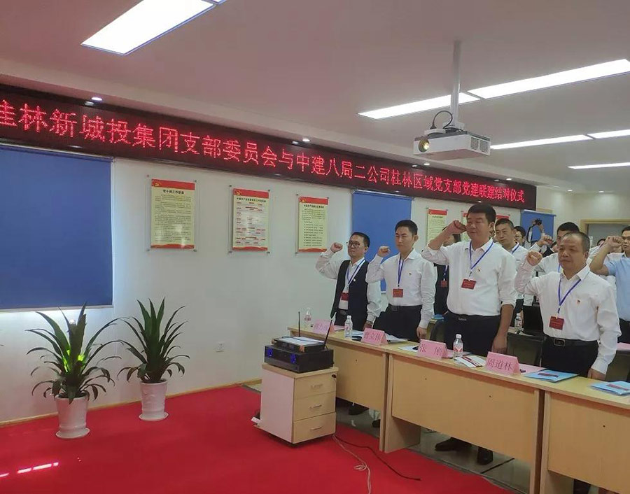 2018年10月30日上午,中共桂林新城投資開發(fā)集團(tuán)有限公司黨支部與中共中建八局第二建設(shè)有限公司廣西公司桂林區(qū)域黨支部在桂林市臨桂新區(qū)基地項目部舉行黨建聯(lián)建結(jié)對儀式。