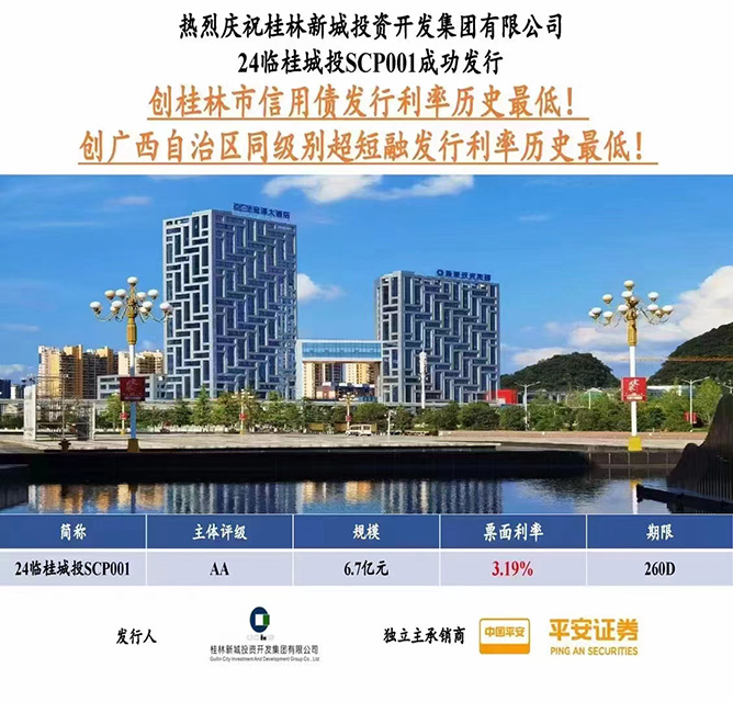 1月9日,桂林城鄉(xiāng)建設控股集團旗下桂林新城投資開發(fā)集團有限公司成功發(fā)行2024年度第一期超短融,規(guī)模6.7億元,期限260天,票面利率3.19%,認購倍數(shù)5.08倍,本期超短融由平安證券獨立承銷。此次成功發(fā)行超短融創(chuàng)下桂林市有史以來信用債發(fā)行的最低利率,也是有史以來廣西壯族自治區(qū)同級別超短融發(fā)行利率最低!在市委市政府、市金融辦、市國資委、城建集團的指導幫助下,新城投集團認真落實各項決策部署,結合自身實際,爭分奪秒抓發(fā)展,多措并舉促融資。