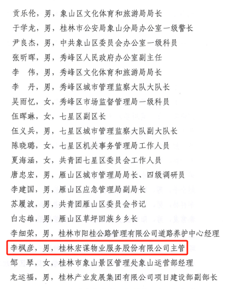 新城投集團(tuán)下屬宏謀物業(yè)公司李楓彥同志獲環(huán)廣西公路自行車(chē)世界巡回賽桂林市籌備工作先進(jìn)個(gè)人榮譽(yù)稱(chēng)號(hào)