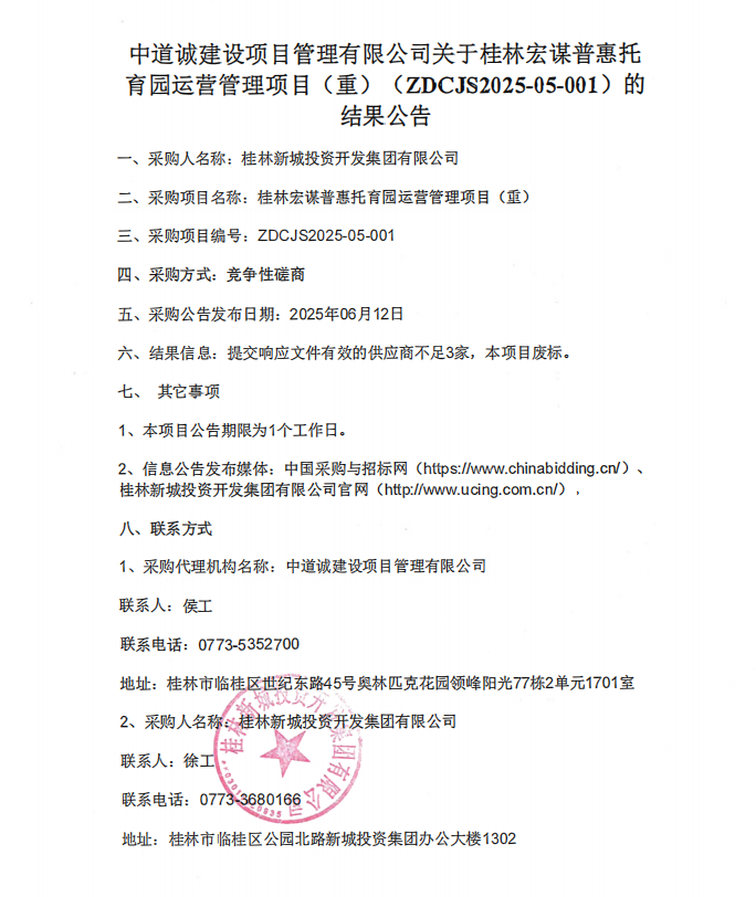 中道誠建設(shè)項目管理有限公司關(guān)于桂林宏謀普惠托育園運營管理項目 ( 重 ) ( ZDCJS2025 - 05 - 001 ) 的結(jié)果公告