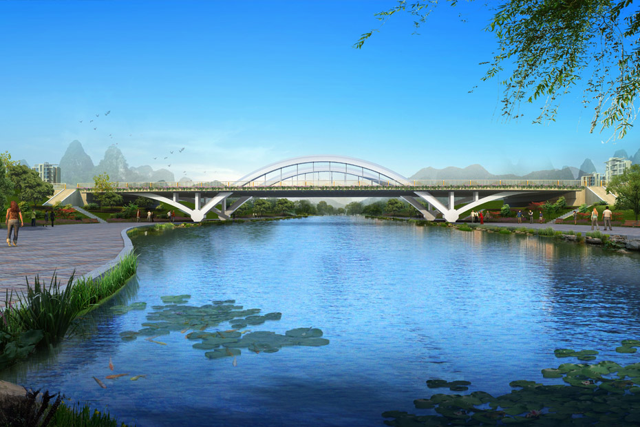 萬平橋位于萬平路與西城大道交叉口西側(cè),橫跨中心環(huán)形河水域,是目前臨桂新區(qū)所有橋梁當(dāng)中,投資最大、結(jié)構(gòu)最復(fù)雜、施工難度最大的一座橋梁。橋梁設(shè)計為中承式飛燕拱橋,采用Y構(gòu)鋼管混凝土拱橋組合體系,外觀新穎獨特,顏色鮮明亮麗,橋長123m,橋面寬度60m,全橋分左右兩幅,每幅橋在人行道及中央分隔帶處各設(shè)置拱肋,共設(shè)4道拱肋、28根吊桿。